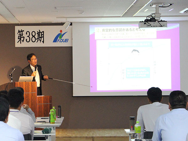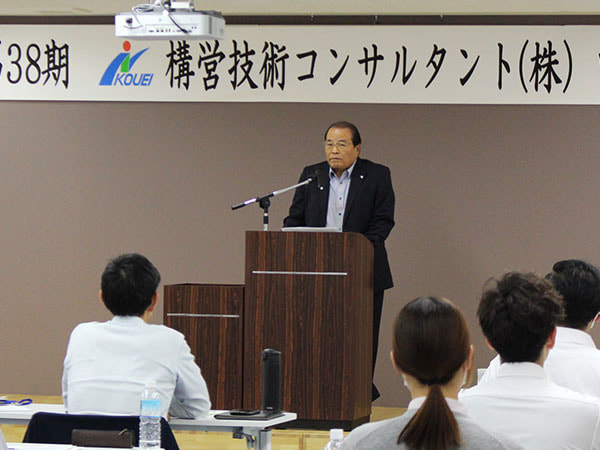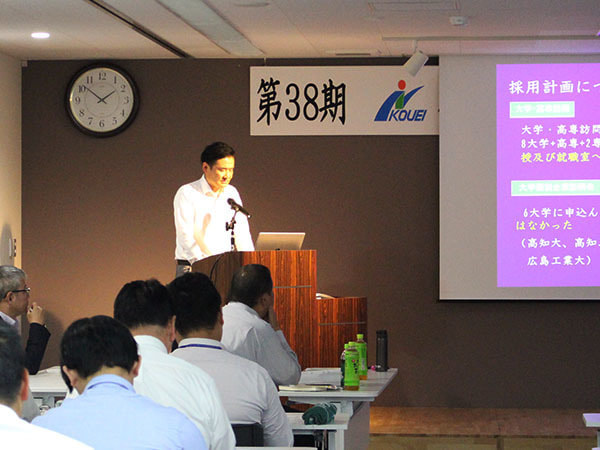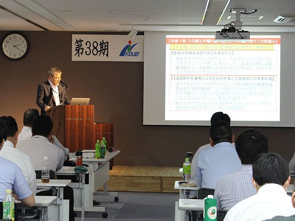 前半では、はじめに水野社長より「経営理念」「第37期の総括及び評価・課題」「第四次5ヶ年計画経営ビジョン」の発表があり、続いて各部長より「第4次5ヶ年計画における各部の組織計画」について、水野社長より「第38期事業計画 第38期の方向性~国交省の受注及び表彰へ向けての取り組み」について、峯川次長より「採用活動計画~福利厚生」について発表がありました。