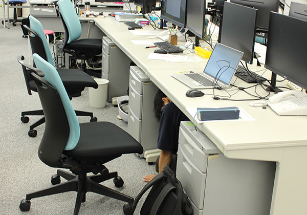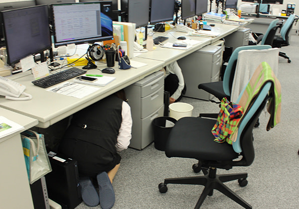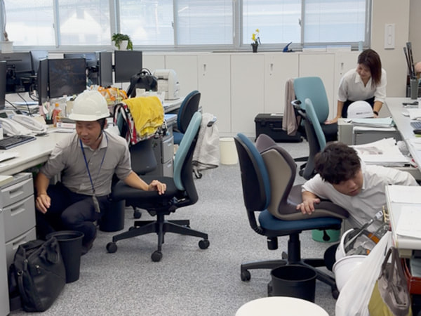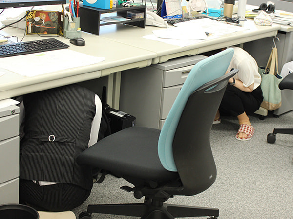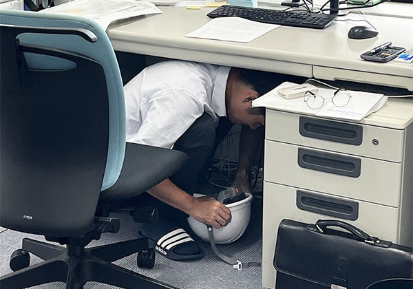 シェイクアウト訓練とは、地震などの災害が起こった際に、①姿勢を低く(DROP)、②頭を守り(COVER)、③動かない(HOLD ON)ことで安全を確保し、身を守るための訓練です。当社では、この訓練に合わせて避難訓練、備蓄物資の確認、業務継続計画(BCP)遂行訓練を行いました。