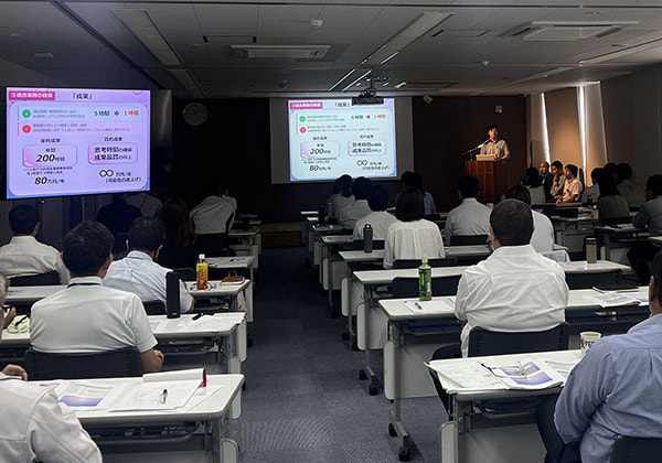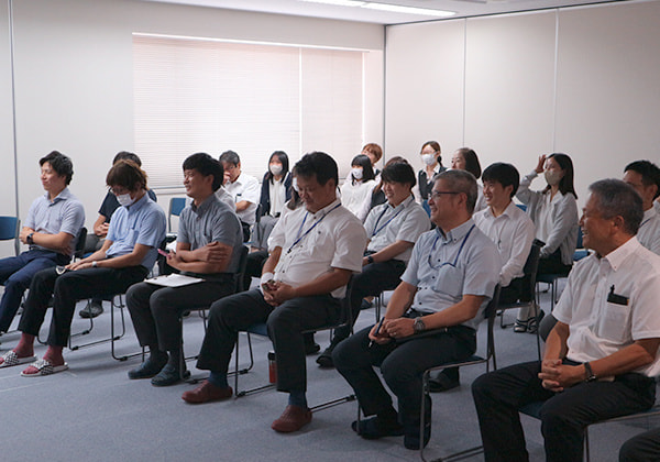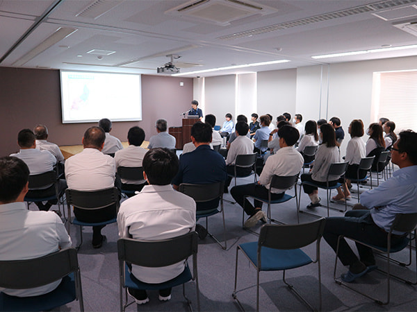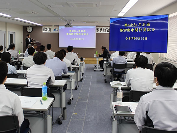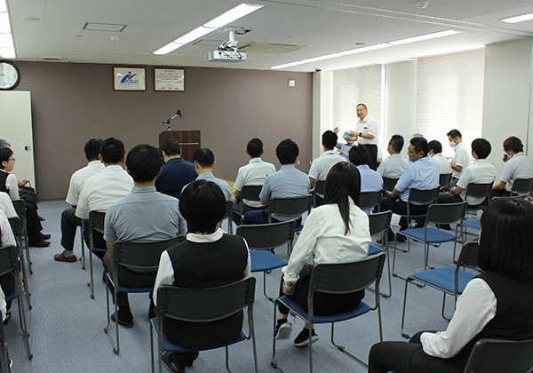 今回は午前中にハラスメント研修を行い、午後からの総会では第39期上半期の総括、下半期に向けての取り組みとして、組織や売上、顧客満足度の向上・残業時間の平準化と削減について発表がありました。さらに、上半期の振返りと期末の目標達成に向けての取組みについても各部署・各個人が発表を行い、その後は4名の永年勤続表彰も行われました。