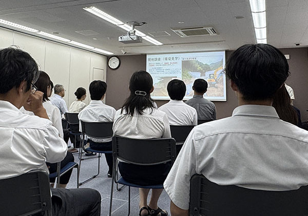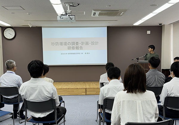 今年は5名の学生さんがご参加くださり、それぞれ①防災コース、②道路・橋梁コースの2コースからご自身の興味のあるコースを選び実務を体験していただきました。