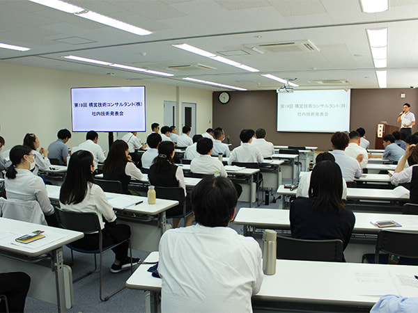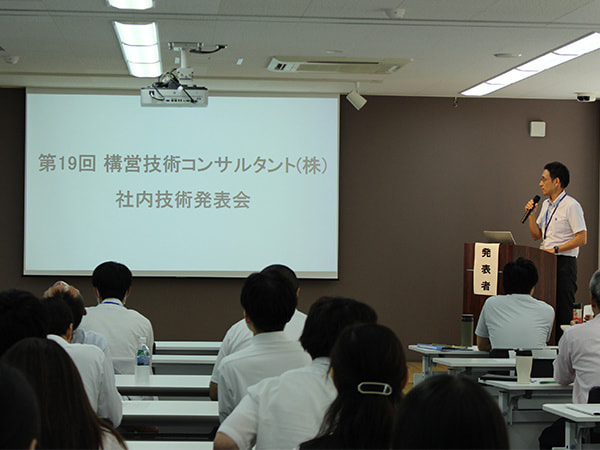 毎年9月初旬に社内技術発表会を開催しております。この発表会は、各社員が専門分野はもとより、他部署の幅広い技術も習得することで技術者としてのスキルアップを図るとともに、社外での技術発表や学会発表を目指して取組んでおります。