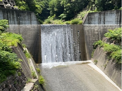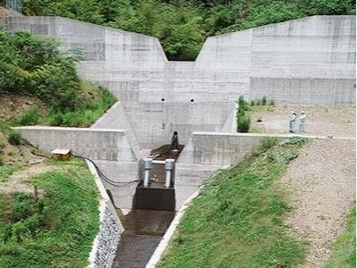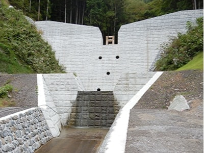周辺環境に配慮するため堤体を石積み模様でデザインした、おしゃれな砂防堰堤が完成しました。