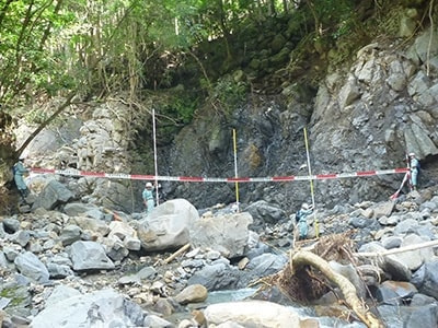 砂防堰堤を設計するために、まず地形や地質、周辺の既設構造物など現地の調査を行います