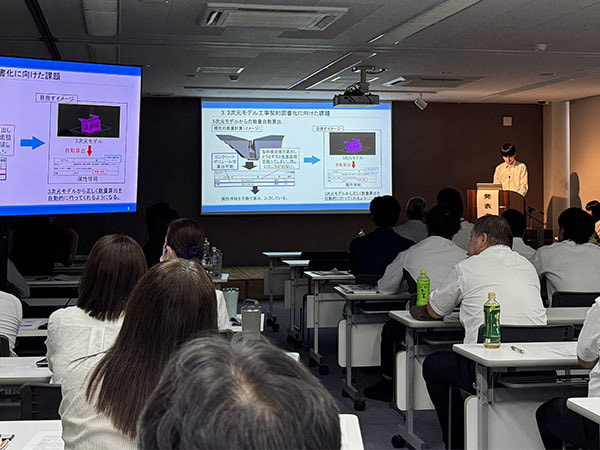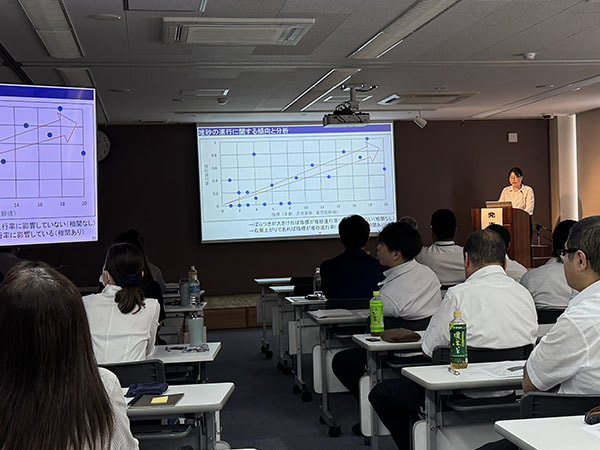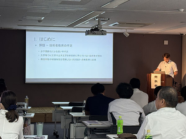 毎年、若手社員から中堅社員まで、10人程度の発表があります。発表内容も若手社員は学生時代の研究テーマや業務報告、中堅社員は日常業務の疑問点を追及したものや模型実験を行ったものなど幅広い内容となっております。令和7年度の発表タイトルは以下の通りでした。