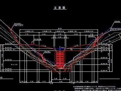 計画をもとにCADを用いて設計図面の作成を行います。写真は砂防堰堤の正面図です。