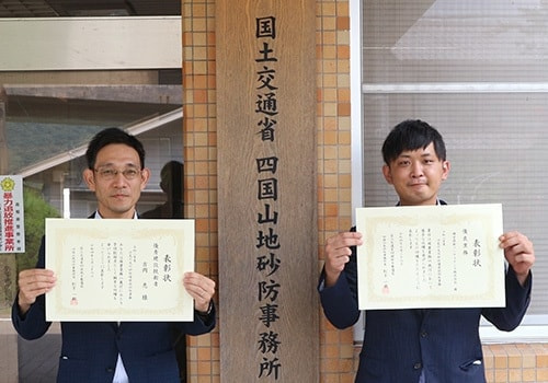 担当業務が表彰されて嬉しそうな吉岡課長と山本君