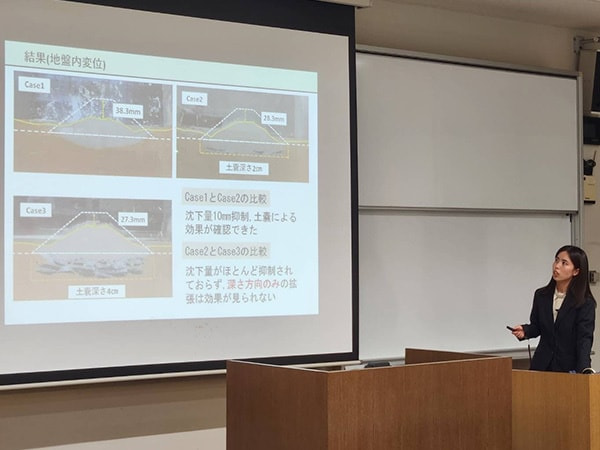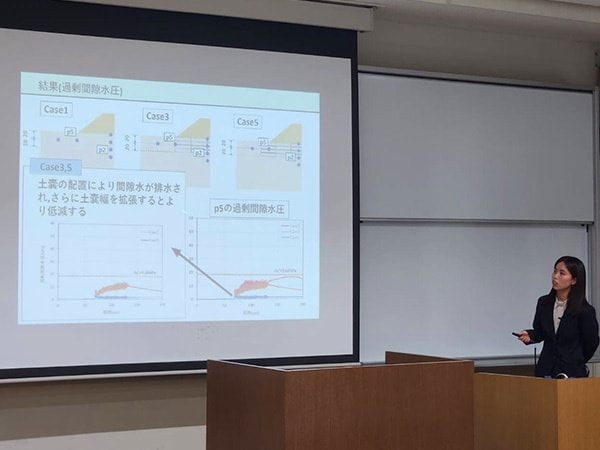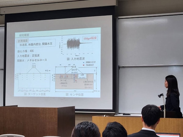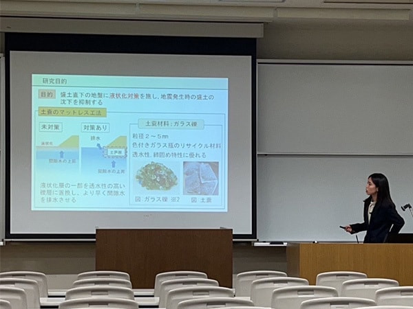 高知工業高等専門学校在学時に携わっていた卒業研究のガラス礫を用いた盛土の液状化対策について発表させていただきました。発表当日はとても緊張していましたが、練習の成果もあり納得のいく発表ができました。