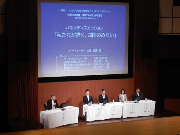 昨年12月の「西日本4支部連携合同提言」にて西日本の将来像の発表がありました。今回「可能性の宝庫 四国のみらいを考える」と題された本シンポジウムでは、四国支部の若手技術者により「四国のみらい」についての発表がなされました。「どこかの真似事ではなく、四国らしさに磨きをかけ、訪れたくなる四国、暮らしたくなる四国へ」というキャッチコピーのもと、四国8の字ネットワークに代表される高速・広域交通ネットワークの整備、滞在型観光拠点の整備、環瀬戸内防災ネットワークの形成など、道路交通・まちづくり・防災の観点から四国の目指す将来像が語られました。