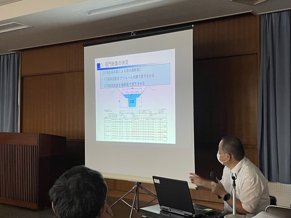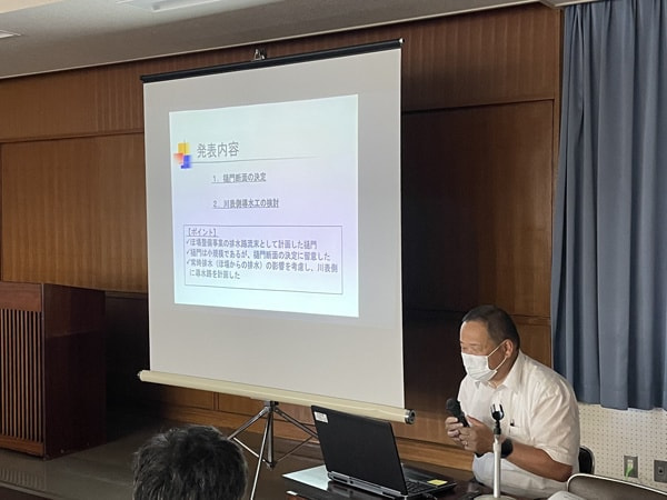 後半は、参加者による樋門の設計における事例発表が行われ、弊社からは友田部長が「ほ場整備事業における樋門設計事例」という表題で発表を行いました。