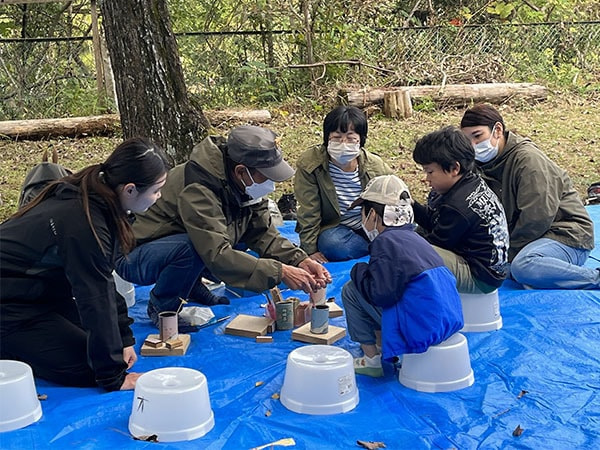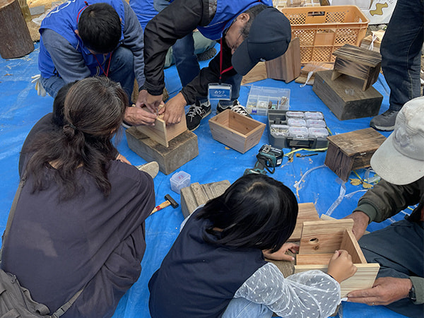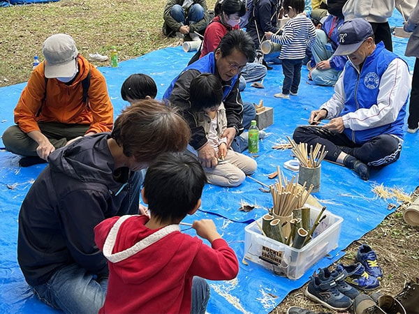 今回もたくさんの子供たちに参加していただき、森の散策やノコギリ体験、マイ箸づくりや楽器作りを体験していただきました。少し肌寒い天気でではありましたが、お昼には町内会の方々が作ってくれた美味しい豚汁をいただき、子供たちも嬉しそうでした。