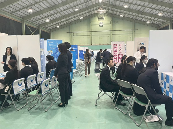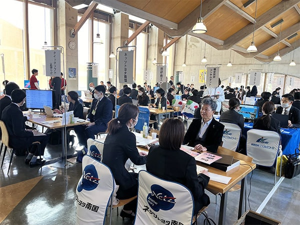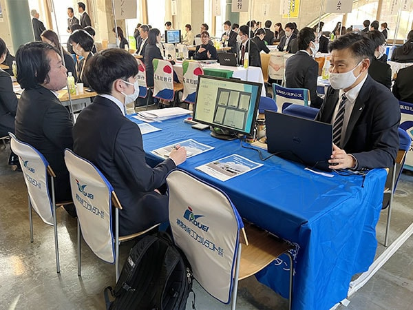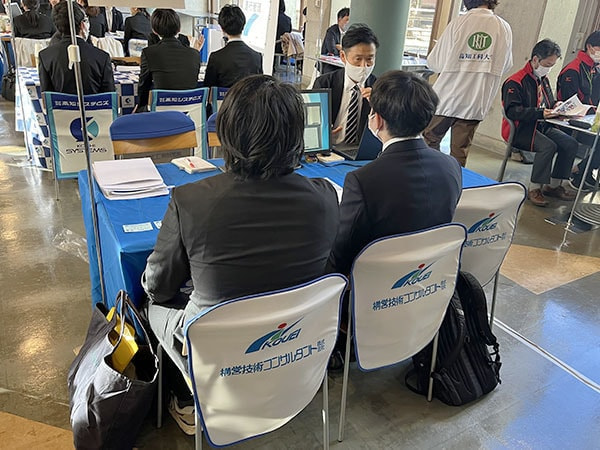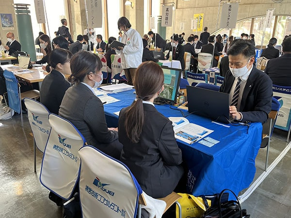多くの企業が参加しており、弊社は午前の部に参加させていただきました。学生の皆さんが積極的に各企業のブースを訪問しており、弊社ブースにも多くの学生さんに来ていただき、熱心に話を聞いていただきました。