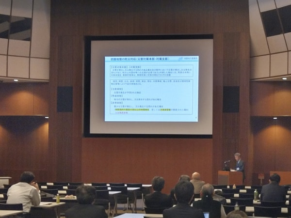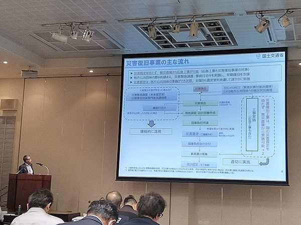 講習会では、実際に災害査定を行う国土交通省水管理・国土保全局防災課から、これまでの事例を踏まえて、「公共土木施設災害復旧事業の基本原則」や「災害復旧事業の新たな取組」、「災害復旧事業の技術上の実務」について、説明が行われました。