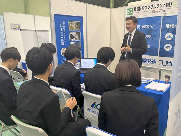 49社の企業が参加しており、学生の皆さんも積極的に各企業のブースを訪問しておりました。弊社ブースにも興味を持ってくれていた学生さんが来てくださり、熱心に話を聞いていただきました。