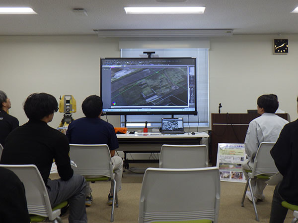 本勉強会は、近年のICT施工に伴う急速進展を見せるドローンを活用した測量に着目し、株式会社ドローンクリエイトの宮内様より「ドローンを使用した起工測量」について、従来の起工測量とドローンを用いた3次元測量の違いや、実際の成果品を使った3次元設計データの内容についてご教示いただきました。