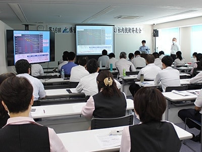この発表会は毎年全社員で行っており、専門分野はもとより他部署の幅広い技術も習得することで、技術者としてのスキルアップを図ると共に社外での技術発表会や学会発表を目指して取組んでいます。